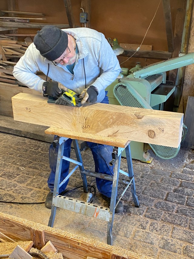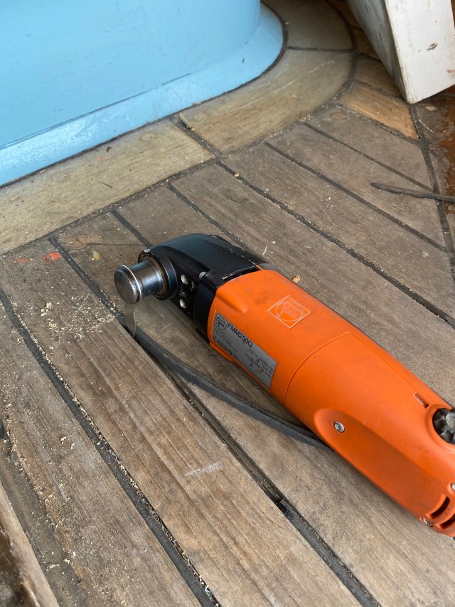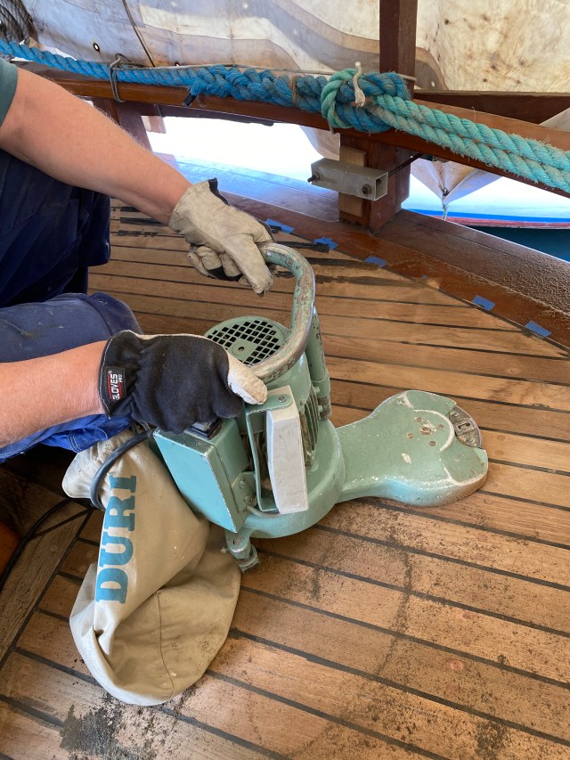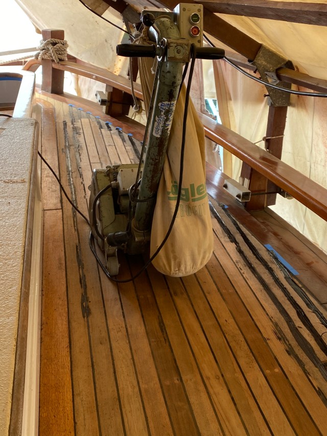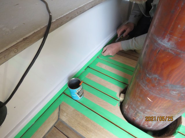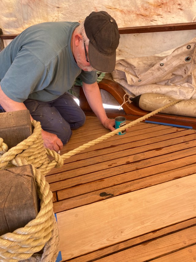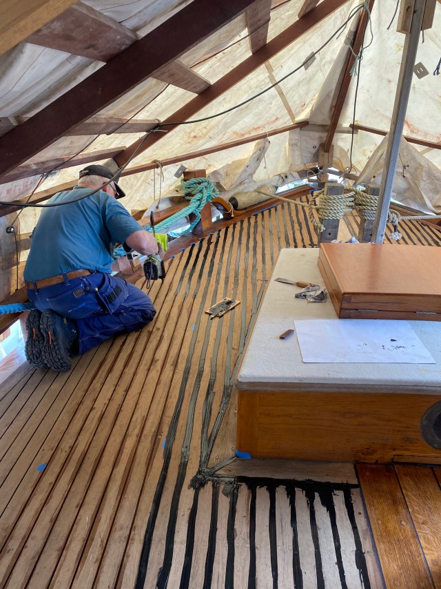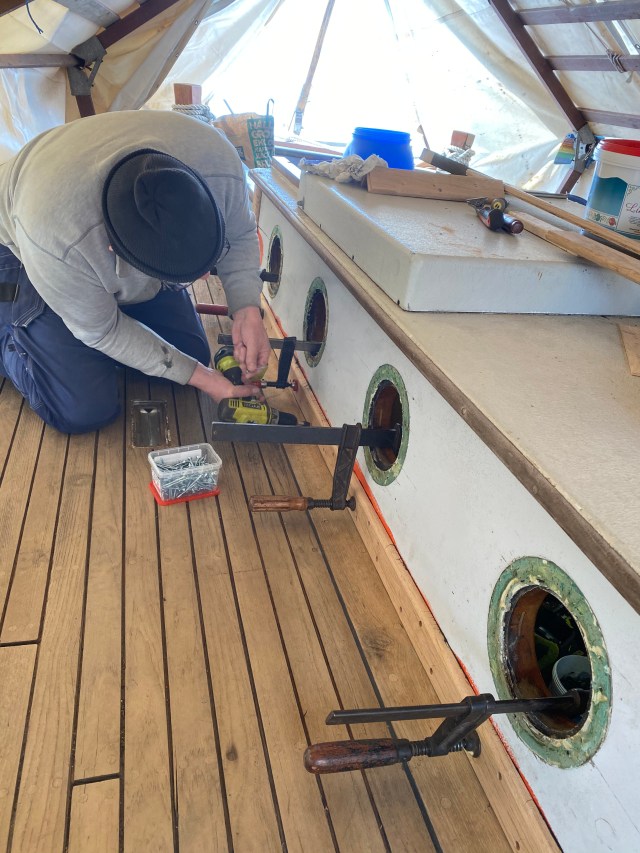 Olle hyvlar på förstärkningen under däck kring masthålet