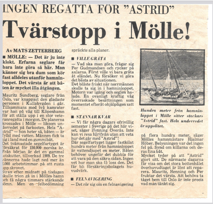 Men det dök plötsligt upp en annan möjlighet. Det hela startade med en tragisk händelse. Norska lotskuttern ”Astrid” gick på grund utanför hamninloppet till Mölle. De var då på väg till Tall Ship Race i Köpenhamn 1974 och skulle bara in och vila en stund. En felnavigering satte stopp för det hela. Se tidningsartikel nedan.
